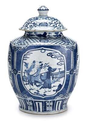 In the Wanli style, domed foliate molded cover surmounting a body showing cartouches of boys at play, buff unglazed base.