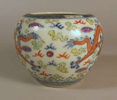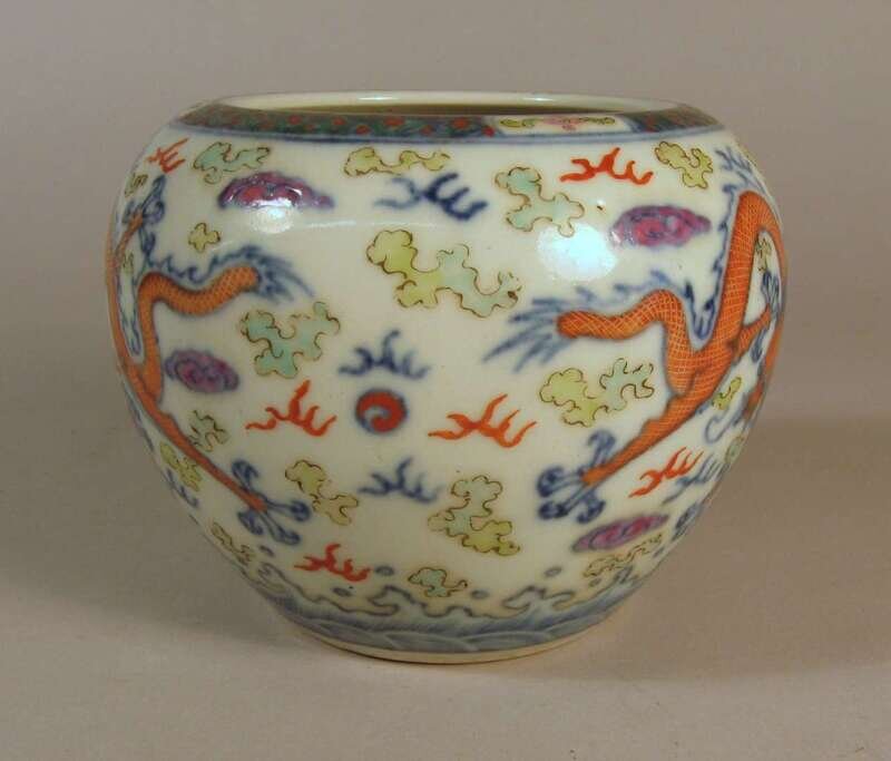 Of globular form, tapering slightly to base; vividly decorated in polychrome palette to depict three dragons flying through cloudy ether between cross-hatch band at rim and band of waves at base.