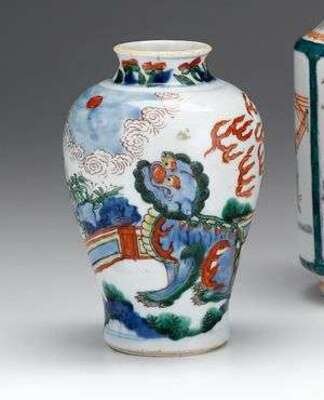 Of small but robust proportions, vividly decorated to depict fu lion among natural, celestial and architectural elements; faint double bands at base and collar, floral decoration to neck.