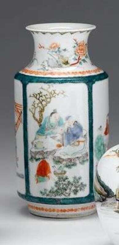 The flared rim over long cylindrical body, raised on circular foot, well enameled to show blossoms and vertical panels of figural landscapes.