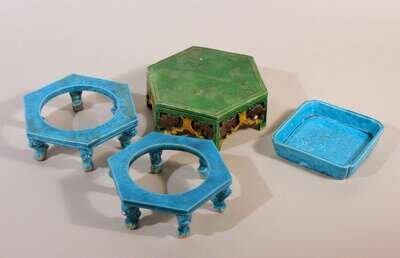 Comprising one egg and spinach platform stand with decorative skirts and two turquoise-glazed stands with circular openings at top and paw feet issuing from mask-form capitals; with square-form turquoise-glazed tray (4).