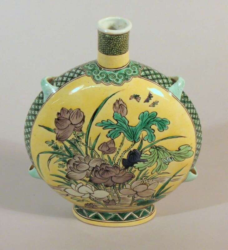 The tall slender neck issues from flattened circular base, with four molded handles, raised on oval foot, enameled to show lotus blossoms.