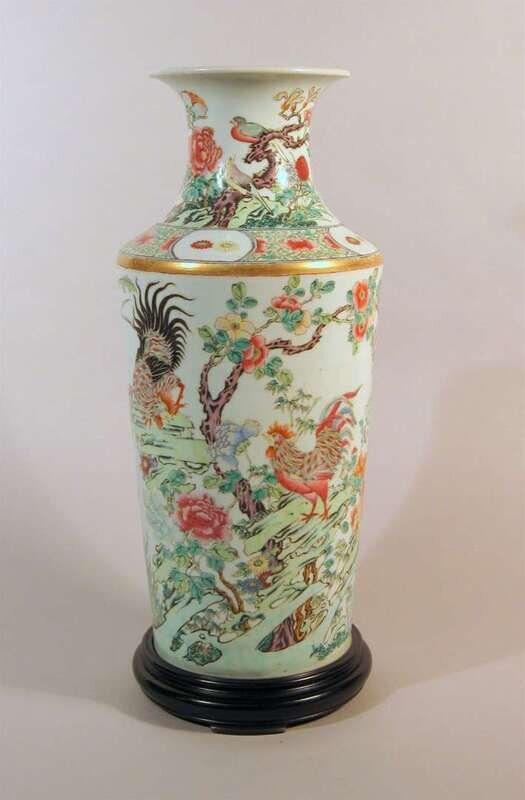 Of cylindrical baluster form, well enameled body to show roosters, chrysanthemum, and peony, wood stand.