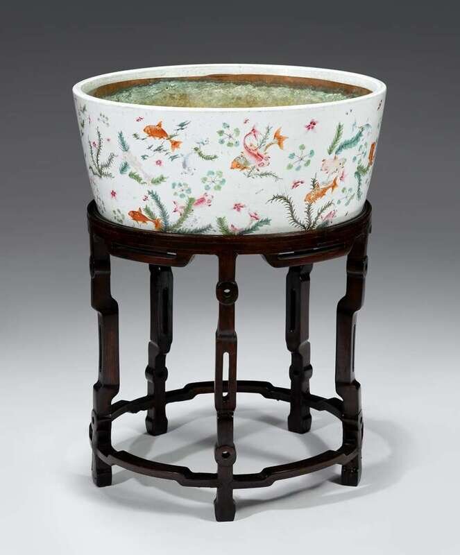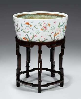 Of tapering cylindrical form, well enameled to show iron red and famille rose carp among green aquatic sprigs, copper insert and later hardwood stand.