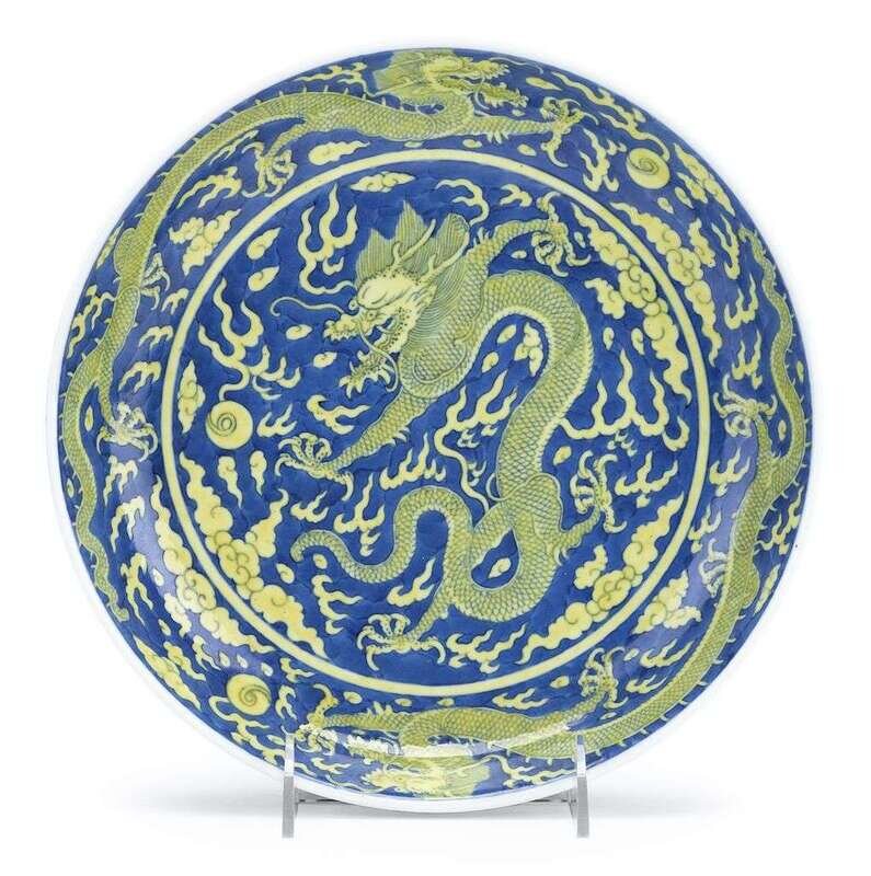 Large Chinese yellow enameled and blue glazed 'double dragon' porcelain dish qianlong mark and of the period