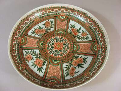 Of slightly rounded form, typical iron red and green glazed mums and central Persian stylized medallion.
