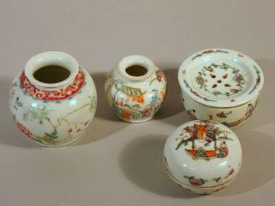 Comprised of two compressed vases, and two covered boxes, all enameled to show foliate sprigs and figural landscapes.