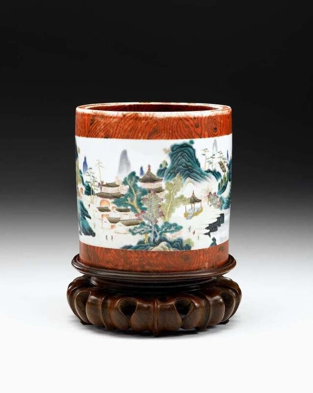 Highly important and rare Chinese faux bois, wood grain and famille rose porcelain brush pot qianlong/jiaqing period