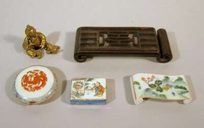 Comprising a carved scroll-form hardwood brush rest, a good porcelain scroll-form brush rest, a porcelain paste box, a rectangular porcelain box and a bronze model of a sitting boy with goose.