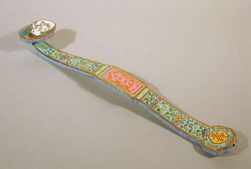 Of lingzhi form, well enameled to show Indian lotus flowers and scrolls within blue Greek Key, turquoise underside.