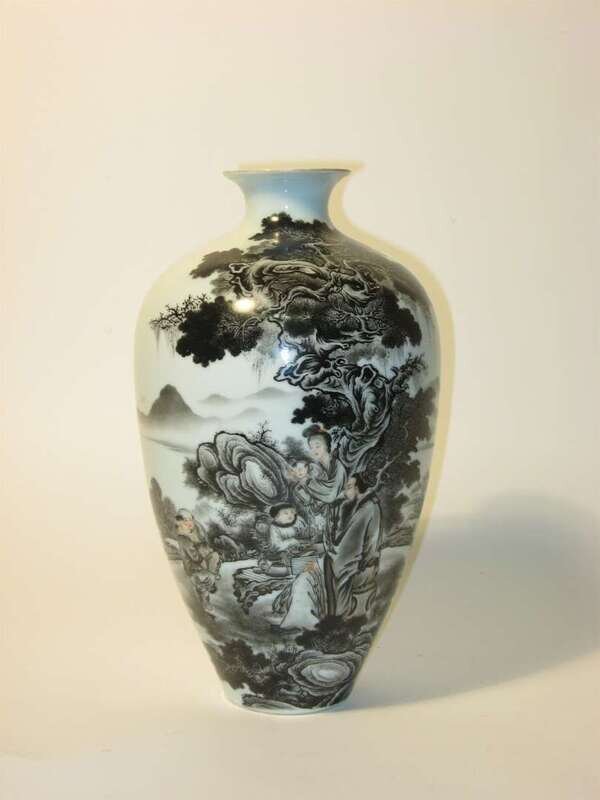 Of tapering ovoid form with flared rim; well-detailed black and polychrome decoration depicts classical scene of scholar and family in natural setting; inscription verso.