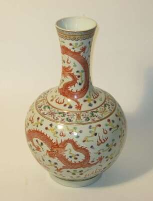 Of baluster form, flared mouth from slender neck, over wide shoulder body, well enameled iron red dragons to neck and body, Indian lotus and Shou symbols worked to shoulder, elongated dragon chasing pearl to body, sea scroll to base, six character mark to base.