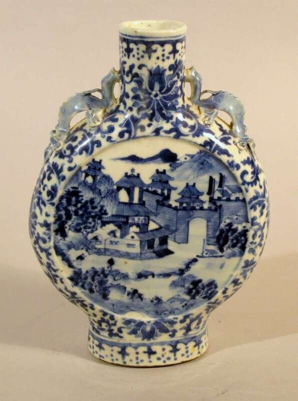 Of typical form, molded qilong handles, figural landscape to Indian Lotus ground, over oval foot.