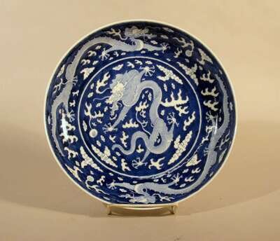 Of slightly rounded form, white central dragon over blue ground, continuing to underside, white glazed base blue mark.