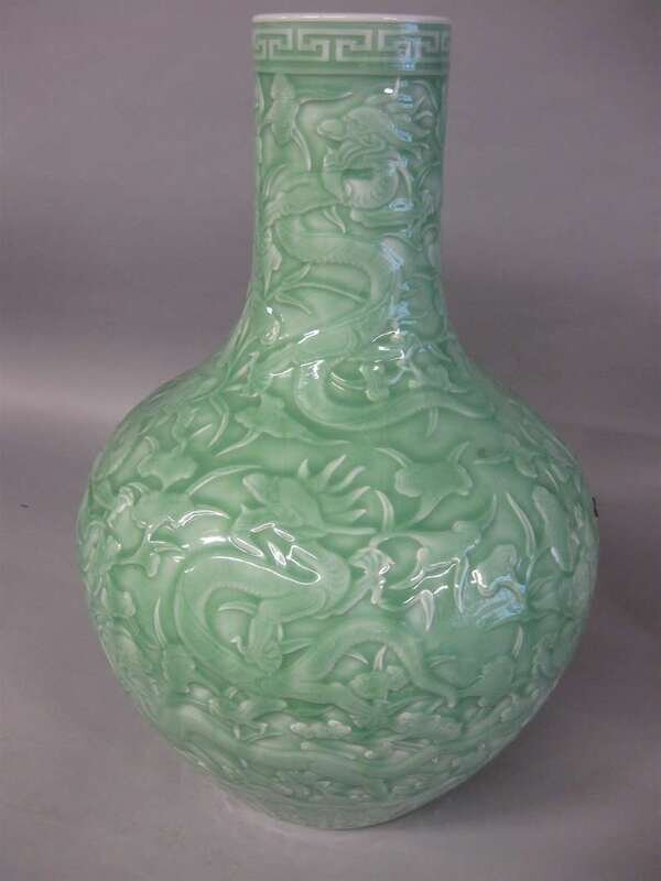 Large Chinese carved and celadon glazed 'dragon; vase qianlong mark, 19th century