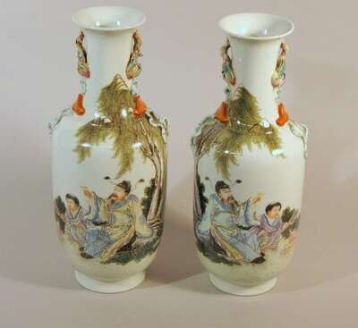 Pair of Chinese applied and famille rose porcelain vases jurentang iron red mark, 20th century