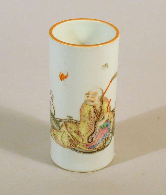 Of cylindrical form, delicately enameled Damo with insects, glazed base, unglazed foot.