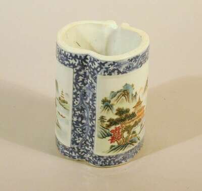Of tall cylindrical near persimmon form, well painted famille rose landscape within blue underglazed bands.