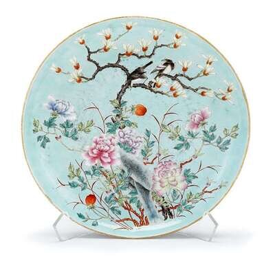 Of slightly rounded form, typical interior enamel of black birds, peonies and rock work on turquoise ground, famille rose lotus verso, white glazed base and iron red marks.