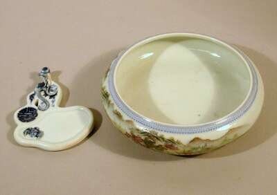 Of shallow circular form, well painted landscape to outer wall, bright blue enamel rim, foot and mark to base, together with a blue underglazed double gourd brush washer.