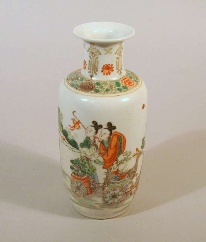 Of baluster form, cylindrical body enameled to show court beauties with deer chariot.