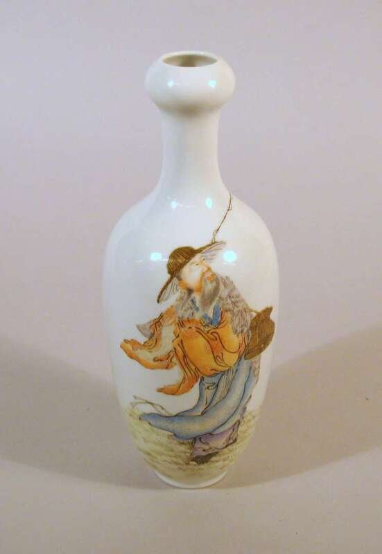 Near garlic head form, slender neck over baluster body well enameled to show immortal, mark to base.