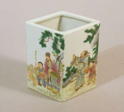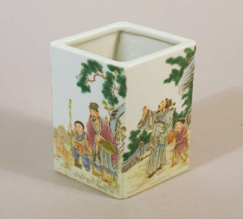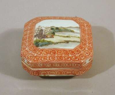 Canted square paste box, iron red decoration enclosing famille rose landscape, together with triangular famille brush pot with four characters Qianlong mark.