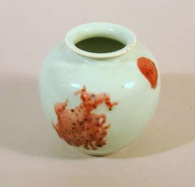 Of squat, ovoid form with everted rim; sparse, amorphous decoration of raspberry hue.