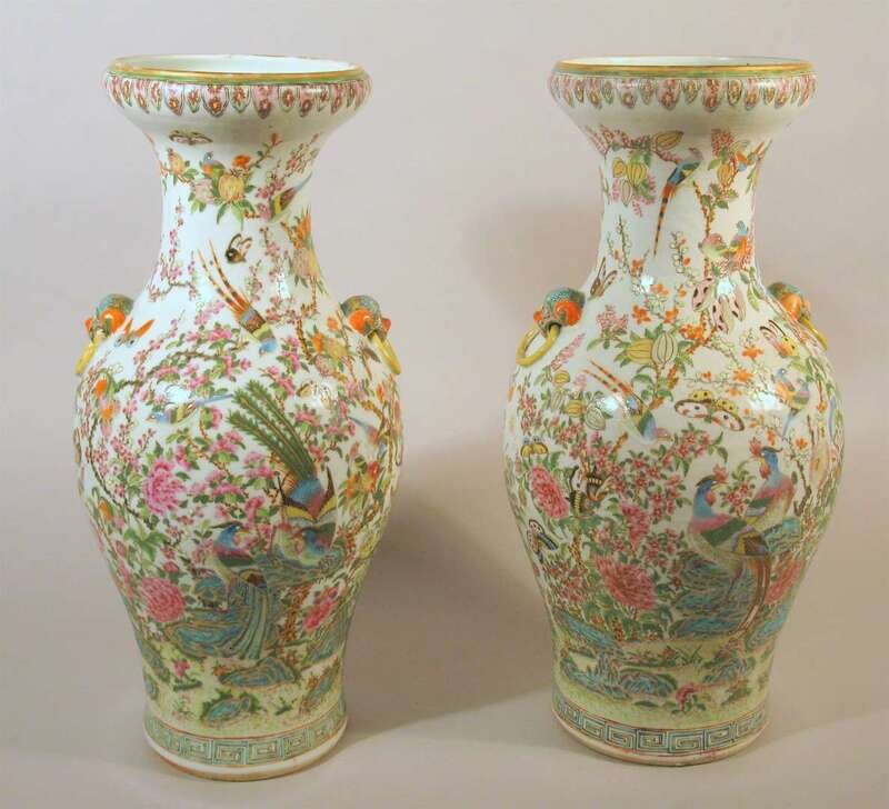 Of baluster form with molded mask handles and rounded, inverted rims, vividly decorated to show exotic birds, butterflies and flora between key band at base and floral lappet band at rim (2).
