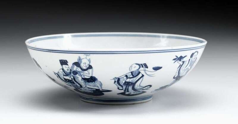 Medium-deep rounded body decorated to the exterior with images of the eight immortals between double bands at rim and on footring; interior with double band at rim and at bottom, circling image of Shoulou with a deer.