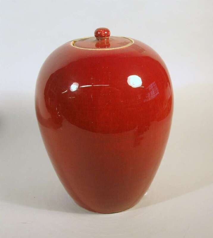 Of tall and robust ovoid form, with inset lid; even raspberry tone.