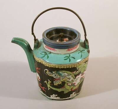 Of tapering, slightly-lobed and cylindrical form; brightly enameled to depict two celestial dragons over black ground; with bronze swing handle; raised on slight bracket feet.