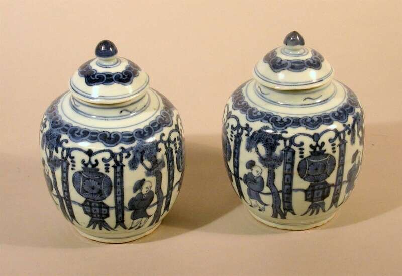 Pair Chinese Wanli style covered blue and white porcelain jars Qing dynasty