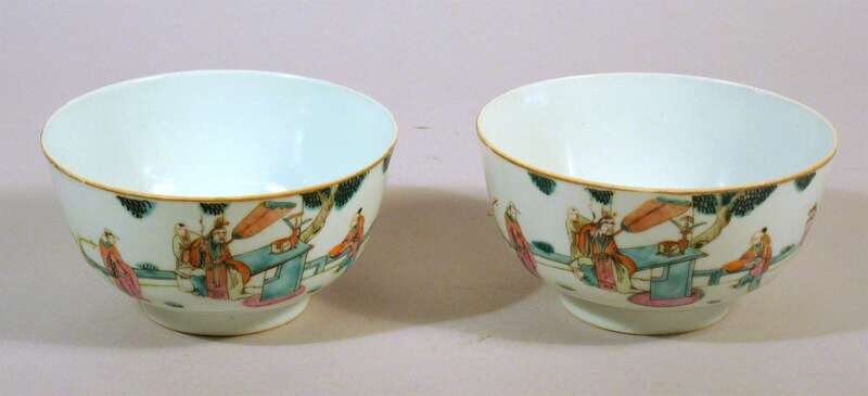 Sparsely decorated in famille rose palette to depict scene of emperor and attendants (2).