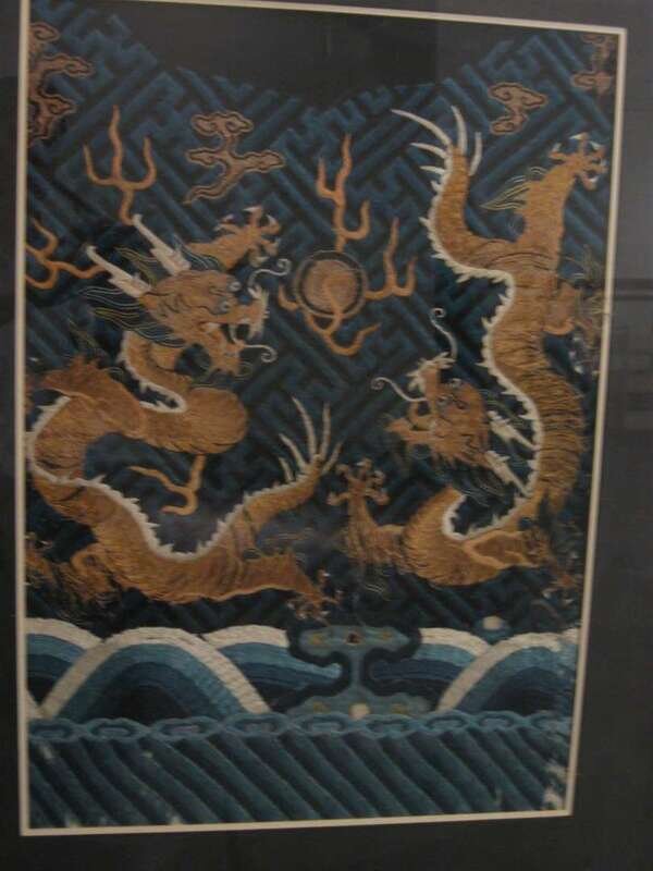 Of tall rectangular form, depicting central dragon on gold thread, panel framed.