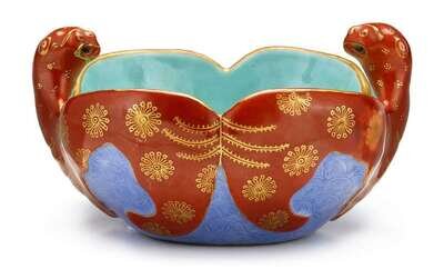 Wing form molded edge, issuing two bat heads from wide spread wings, gilt decoration over iron red ground, supported by a blue scrolling sea, iron red mark to base.