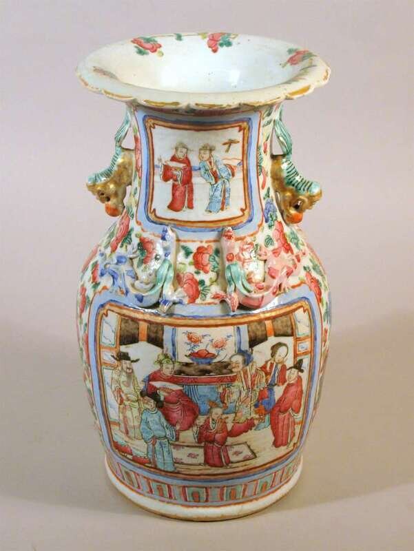 The scalloped rim above two qilong and fu dogs, enameled figural landscape to body enclosed by foliate sprigs.