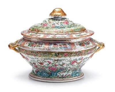 Gilded domed finial over stepped cover, oval base molded to show two branch handles raised on an oval foot, well enameled to show birds and foliate cartouches to green foliate sprig ground.