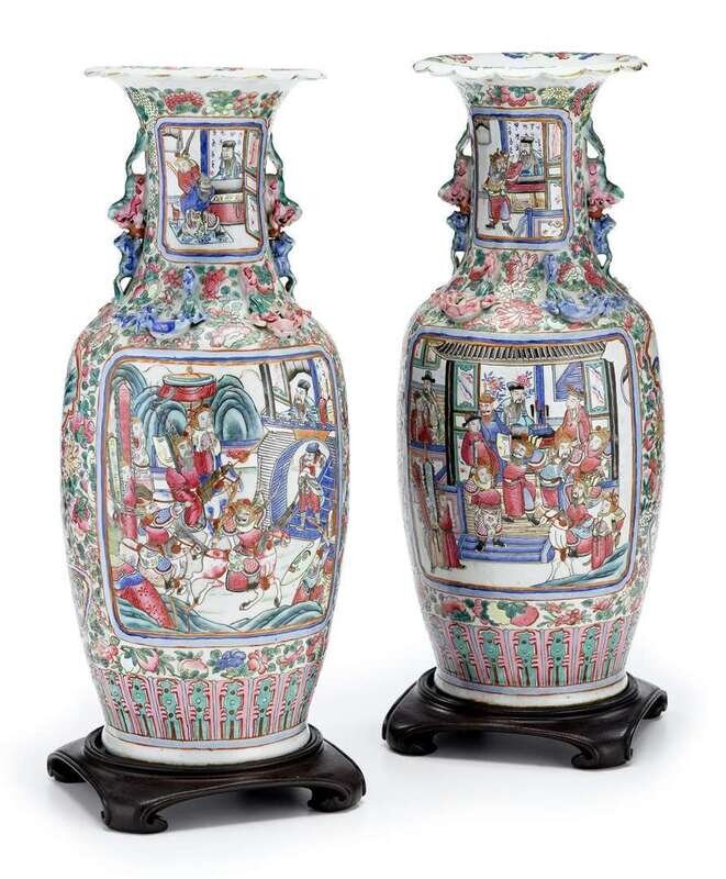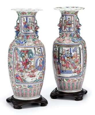 Of baluster form, shaped rim over qilong and fu dog molded neck enameled to show detailed figural landscapes over a ground of foliate sprigs.