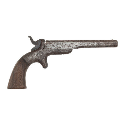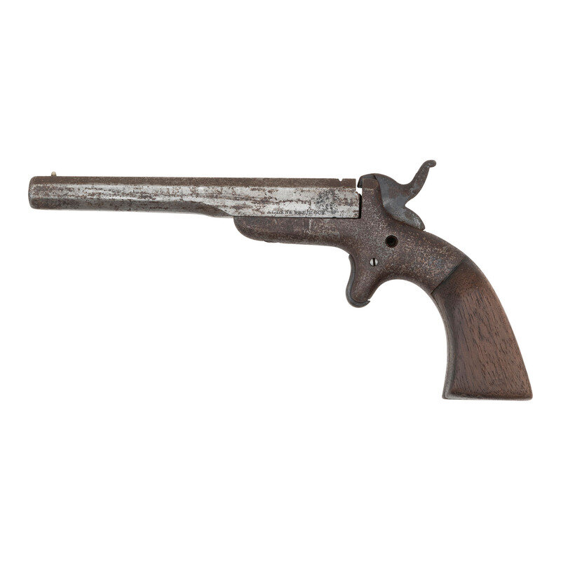 3) Allen & Wheelock Single Shot Pistol: .32RF, 5" barrel, NSN. No finish with heavily oxidized metal. Grips old, poorly made and poorly fit replacements. {ANTIQUE}