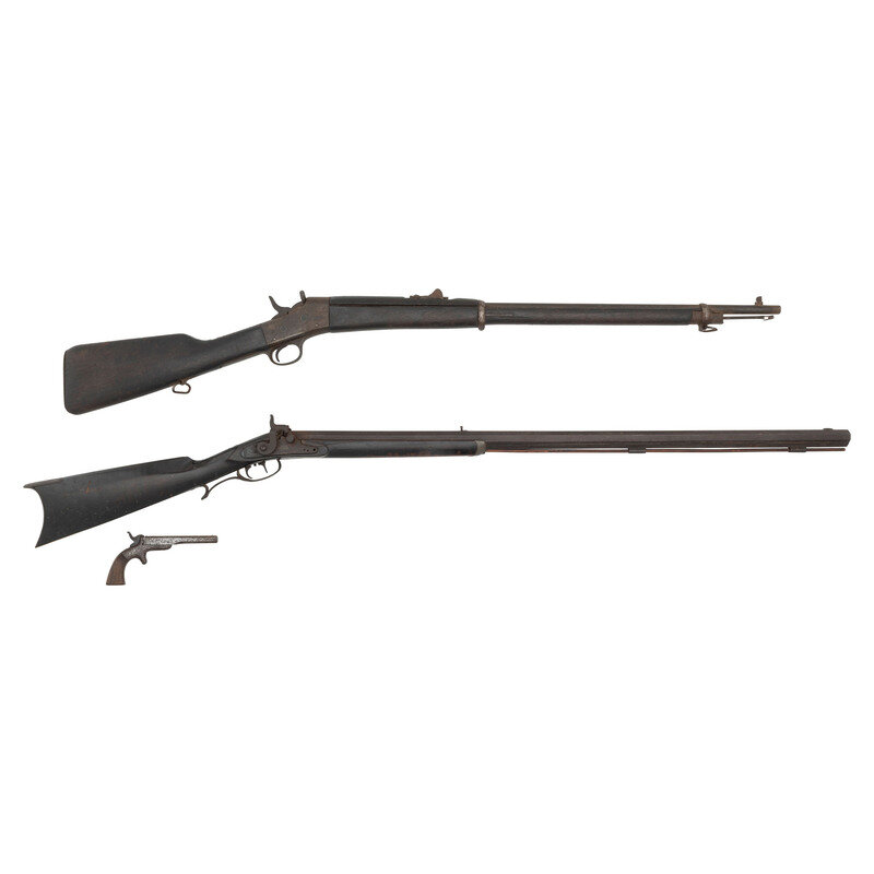 3 Antique Guns: Remington Rolling Block Rifle, Half-Stock Percussion Rifle, Allen & Wheelock Single Shot Pistol