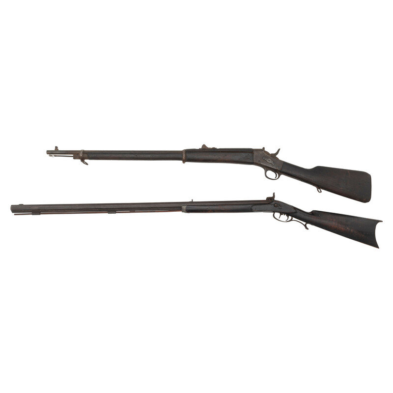 2) Half-Stock Percussion Rifle: .35 caliber, 36" pinned octagonal barrel, NSN. No finish, heavily oxidized metal, iron furniture, hardwood stock with raised cheek rest. No markings. Equipped with a commercial percussion lock with double set triggers, semi-buckhorn rear sight, dovetailed front sight blade, and an old wood ramrod.