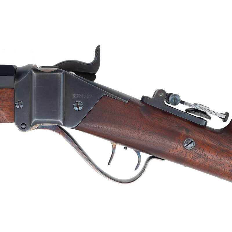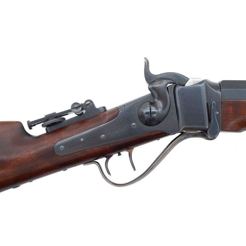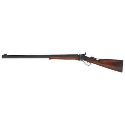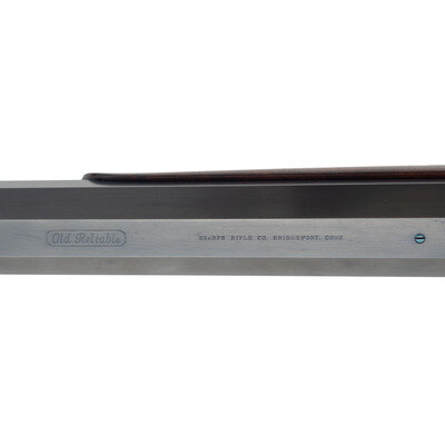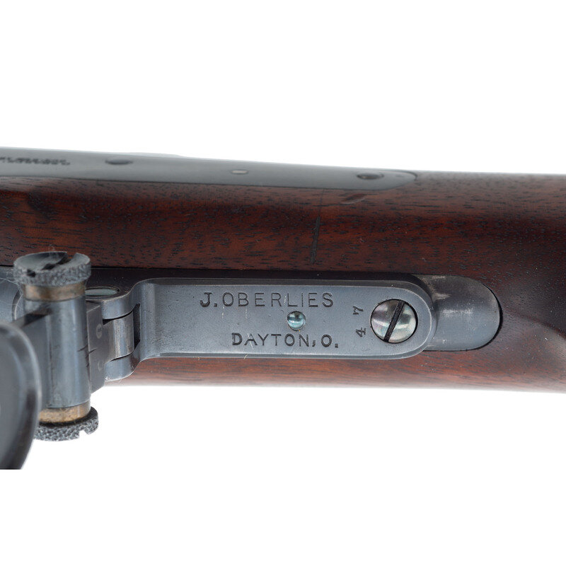 .45 Caliber. 30" heavy octagon barrel. SN: 156377. Blued finish, bright breech block, color casehardened lever, figured walnut smooth straight grip stock with checkered steel shotgun butt and smooth, semi-Schnabel forend. Single shot falling block Sharps "Old Reliable" Rifle restored and customized by John Oberlies with double set triggers and Oberlies marked tang mounted peep sight with oversized dovetailed front sight blade. Standard Sharps markings, barrel with mismatched serial number 160291 and marked 11 5/16 for 11 pounds, 5 ounces weight. No case length given for the caliber marking, suggesting the chambering is .45-70. A lovely restoration and customization job done by a famous Dayton, OH gunsmith that would likely be a fine long range black powder cartridge competition rifle. Note that due to weight extra shipping costs will apply. {ANTIQUE}