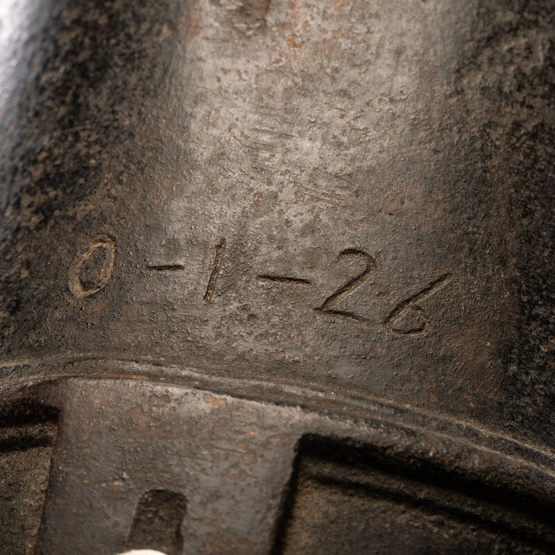 1.5" caliber. 20" barrel length. SN: NSN. Black painted cast iron swivel gun set on a wood base composed of a tree stump. Breech is engraved 0-1-26 with a {Broad Arrow} struck into the top of the gun tube between the trunnions. Item lacks builder's marks but is consistent with examples produced by Cook's Arsenal Works.