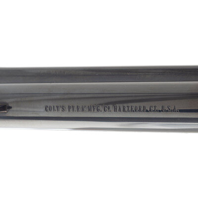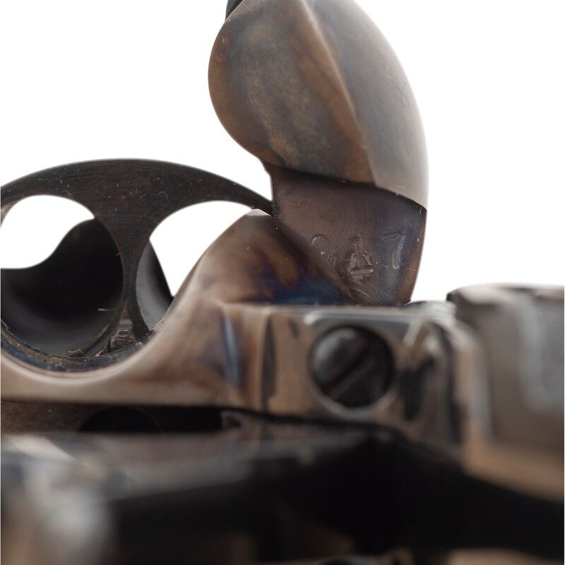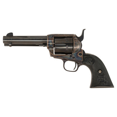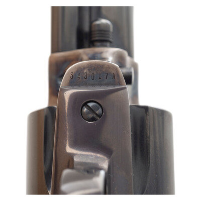 .45 Colt. 4.75" barrel. SN: S43017A (mfg. ca. 2007). Blued and color casehardened finish, checkered black plastic "Eagle" grips with Rampant Colt logo. Single action solid frame revolver with fluted six-chambered cylinder, loading gate and barrel mounted ejector rod. Revolver with a slick, custom tuned action and re-contoured hammer with a long, tall spur. {MODERN}