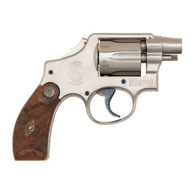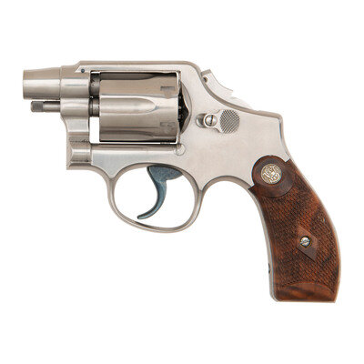 .38 Special. 1.5" barrel. SN: D420117. Bright steel finish, blued trigger, checkered S&W medallion grips. Double action hand ejector revolver with fluted six-chambered swing-out cylinder, frame notch rear sight and no front sight. Modified for deep concealed carry with shortened barrel, bobbed hammer and tuned action. The full cock notch was removed from the hammer during the work, making it a true "double action only" revolver. {MODERN}