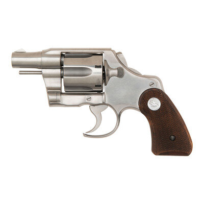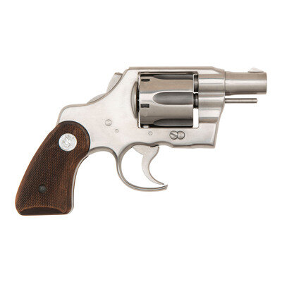 .38 Special. 2" barrel. SN: 528008 (mfg. ca. 1949). Bright finish, checkered hardwood Colt medallion grips. Double action revolver with fluted six-chambered swing out cylinder. Customized in the form of the classic "Fitz Special" with the front of the triggerguard cut away, hammer spur bobbed, the barrel slightly shortened and recrowned, the grip frame shortened and the ejector rod modified with the tip removed. The action was tuned and made smooth and although the hammer was bobbed for "double action only" operation, the full cock notch was not removed from the hammer. Front sight re-contoured to a more angular blade, standard frame groove rear sight not modified. {MODERN}