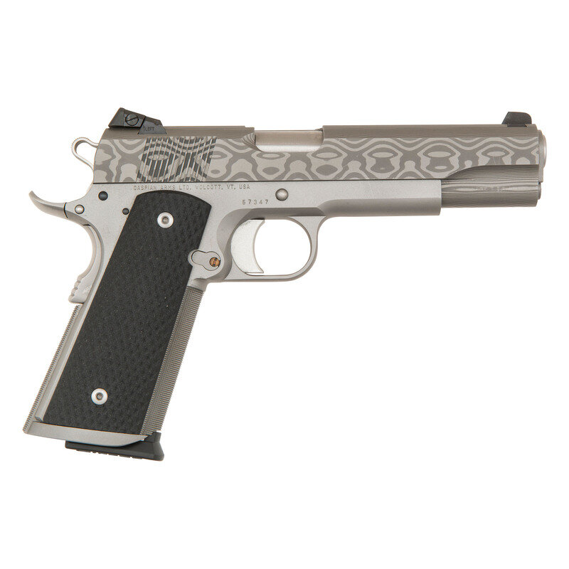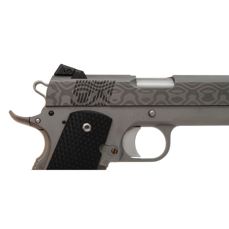 .45 ACP. 5" barrel length. SN: 57347. Matte finished Damascus steel pattern slide with matte steel frame mounting checkered black G10 grips, and adjustable matted rear notch and Tritium night front sights. Short-recoil operated single action autoloading pistol fed by detachable single stack magazines. Item conforms to the Colt Government Model design with an assortment of custom components including: smooth adjustable trigger, extended magazine release, high cut frame with checkering to gripstrap, Ed Brown memory groove extended beavertail grip safety, checkered flat mainspring housing with flared and extended magazine well, extended safety lever, Ed Brown bushing, and a skeletonized Commander style hammer. Right frame struck with the manufacturer marking CASPIAN ARMS LTD. WOLCOTT. VT. USA. {MODERN}