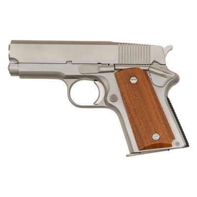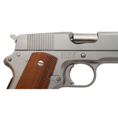 .45 ACP. 3.5" barrel. SN: CR19569. Matte stainless finish, checkered hardwood grips. Single action custom compact semi-automatic pistol with removable magazine and numerous custom features. In the early 1970s, when no such thing a Colt 1911 "officers" model existed, the only way to get a hideout sized 1911 was to have one "chopped and channeled" by a custom pistolsmith. Enter the Detonics company of Bellvue, later Seattle, WA that brought the compact concealment 1911 into its own and made it reliable as well. The guns featured shortened frames, slides and barrels to enhance concealability and the custom upgrades demanded by people like law enforcement officers who relied upon their firearms to to keep them alive. After filing for bankruptcy in the early 1980s, the firm was purchased and reborn under new ownership and continued to produce guns into the late 1980s. This is one of the latter day Detonics pistols, with the classic DETONICS 45 slide mark on the left, over Mk VII. The lower right of the frame has the model, location and serial number, as was standard on the mid to late 1980s production guns. Some of the special features of the Combat Master include the tapered, cone-muzzle bushingless barrel that would become a standard feature on later compact 1911s, a full-length recoil guide rod, a short spur hammer, a pinned in place extended beavertail grip safety and a specially contoured top rear to the slide that allowed for easy thumb cocking of a pistol carried in "Condition 2". This machining also pushed the rear sight of the standard production pistols forward about 1.25" from the usual location, which provided a better sight picture. The Mark VII pistols were produced without sights and with the matte stainless steel finish. Detonics would become a serious innovator in the production of stainless steel pistols. The pistol is accompanied by a single Detonics marked magazine. The Detonics came into its own as a pop culture firearm when it was used during seasons 1-3 of Miami Vice as Detective "Sonny" Crocket's back up gun, worn in an ankle holster. {MODERN}