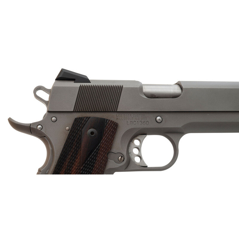 .45 ACP. 5" barrel length. SN: LBC1360. Matte stainless steel finish overall mounting diamond checkered walnut grips with NOVAK'S sights consisting of a tritium front bead and rear line. Short recoil operated single action autoloading pistol fed by detachable single stack magazines. Item features a wide array of custom features from Les Baer including: Baer beavertail grip safety with pad, adjustable speed trigger, extended magazine release, extended safety lever, front and rear cocking serrations, Briley style bushing, full length guide rod, high cut forward gripstrap, checkering to gripstraps, one piece flared magazine well extension, and skeletonized Commander hammer. Item mounts an Ed Brown barrel. Magazine is a Wilson Combat pattern with synthetic follower. {MODERN}